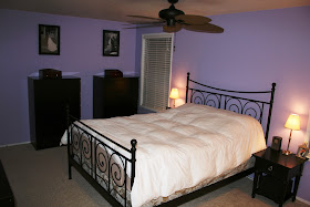 Just finished up another project on our checklist. Ever since I was a little girl my favorite color was purple. I have always wanted to have a purple bedroom and now that we have a house it was time to make that dream a reality! It took a lot of convincing to get Terry to agree having a purple bedroom....BUT when I finally did pick out the paint color and told him it was called "Purple Dragon" he was on board because it sounded a bit more manly! I will admit while we were putting it on we started to get a bit concerned because it was looking a little like I love Barny-ish. Since we had the green Frog Tape on all the molding but after it dried and we took off all the tape and added everything back into the room we absolutely loved it. Even Terry! Just love how the black furniture, white molding and doors look with the lavender. We are extremely pleased with this transformation.