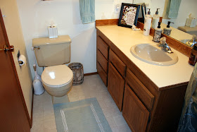 We are really pleased at how updated it makes in the bathroom look. This weekend we will be picking out a light green or light blue color for the walls. Stay tuned for that reveal.