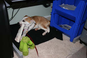 Cooper loves to be near us and when Terry is working in his office he loves to lay underneath his desk and play with his toys!