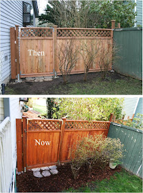 This past weekend I had Terry put some fence around our little garden box since our puppy Cooper has been having the best time jumping in the garden box and tearing out all of my veggie starts! The previous owners left us some fence and a few pieces of lattice. So the handy hubby crafted up this fence to keep the Cooper out! Its not the best most glorious fence ever BUT it is doing its job and keeping Cooper out and best of all it was FREE!  Please ignore the deteriorating green fence behind these photos! It will be replaced sometime this summer or whenever it falls down.