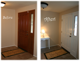 Also have to toss in my normal side by side compairison shots of the before and after! The stained glass window in the door has a bit of pink it it and we really noticed it before we painted the door and now we hardly notice it at all.