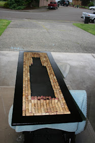 At first our plan was to do a heart out of wine corks but we really needed a larger piece above our TV and it needed to be longer and panoramic. So my clever husband came up with the idea of doing a wine bottle on laying its side! So Sunday night we started in on making the frame. The previous homeowner left us a nice piece of thin particle board that ended up working wonderfully for the back of the frame. We then started in on building the frame and went to Home Depot and bought an 8ft piece of primed MDF moulding for around $5! We went back to the house and Terry quickly built a frame out of it. The next day we applied a few coats of black spray paint. I wanted the corks to pop on the frame and thought the black would look very nice as well as match everything else in our house. I didn't get any shots of us building the actual frame- sorry...but below is finished frame spray painted. I believe the size of the frame was about 4ft by 2ft.
