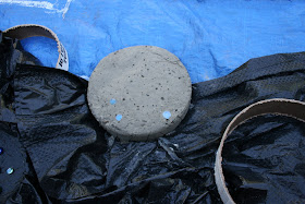 We laid out some tarp because I really didn't want to slop any concrete on the grass or patio. Then put a layer of garbage bags over the rings.