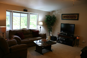 It does feel more open and I do feel a little better about it but it doesn't flow quite right to me. I think what I am going to have to do is get rid of the love seat closest to the front door and move our reclining brown chair (use to be in the family room, now in our guest bedroom) into that position. It will for sure open up the area so much more and hopefully complete the room and we will still have adequate room for lots of people to sit in this room as well.