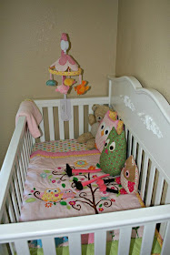 The crib we got online from Amazon it is a Graco Victoria Non Drop Side 5 in 1 Convertable Crib. It got pretty high reviews and I just loved the detailing on the back side of it. So it basically breaks down 5 ways. Three of them are mattress height in the crib and then it will turn into a toddler bed and eventually a day bed. You of course need to buy a new mattress for it when it converts to a day bed. The bedding and mobiles were purchased at Babies-r-us and the theme is called Kids Line Dena Happi Tree 9-Piece Crib Bedding Set .This line also has the mobile and pink stuffed owl pillow  seen below too. The other two stuffed owls were bought at Pottery Barn Kids.